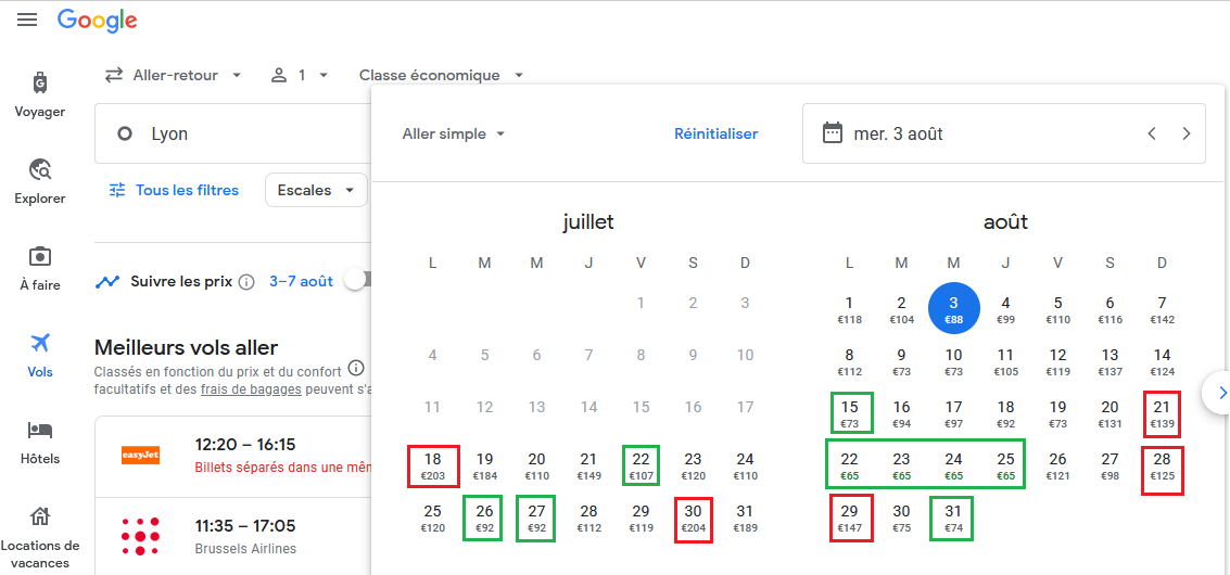 Pour vos avions, utiliser Google Flight, (capture ci-dessus). Le grand avantage, c’est qu’en cliquant sur la date, vous aurez un aperçu de l’ensemble des prix en avance, jour par jour, mois par mois dans une seule fenêtre.