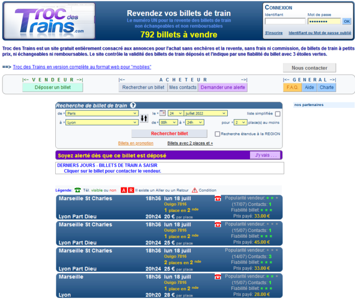 Il s’agit donc d’un site gratuit entièrement consacré aux annonces pour l’achat sans enchères, et la revente, sans frais ni commission, de billets de train à petits prix, ni échangeables ni remboursables. Le site contrôle la validité des billets de train déposés et l’indique par une fiabilité du billet avec 3 étoiles vertes.