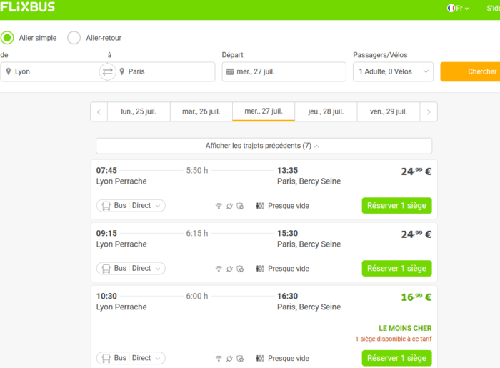 Vous pouvez par exemple faire un Lyon Paris en 6h00 (1h00 de plus qu’en voiture) pour 16,99 euros.