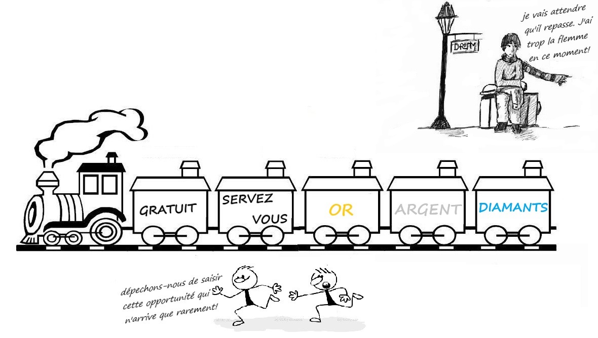 Sur le schéma ci-dessus, l’opportunité du moment est le passage d’un train avec à son bord, des wagons remplis d’or, d’argent et de diamants. Il est mentionné et stipulé clairement sur les premiers wagons que c’est gratuit pour ceux qui se serviront.