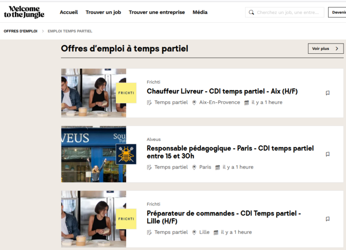 Welcome to the jungle: Même si le titre est en français, il s’agit bien d’une entreprise française ciblant un large public. Là aussi, n’oubliez pas de stipuler « temps partiel » dans la barre de recherche.