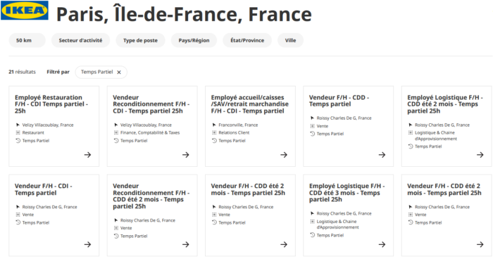 Ikea est un grand groupe, une entreprise suédoise dans laquelle il fait relativement bon de travailler. Sur le site Ikea Job, vous trouverez toujours des CDI à temps partiel, allant de 8h à 25 heures par semaine. Sélectionner « type de poste », puis « temps partiel ».